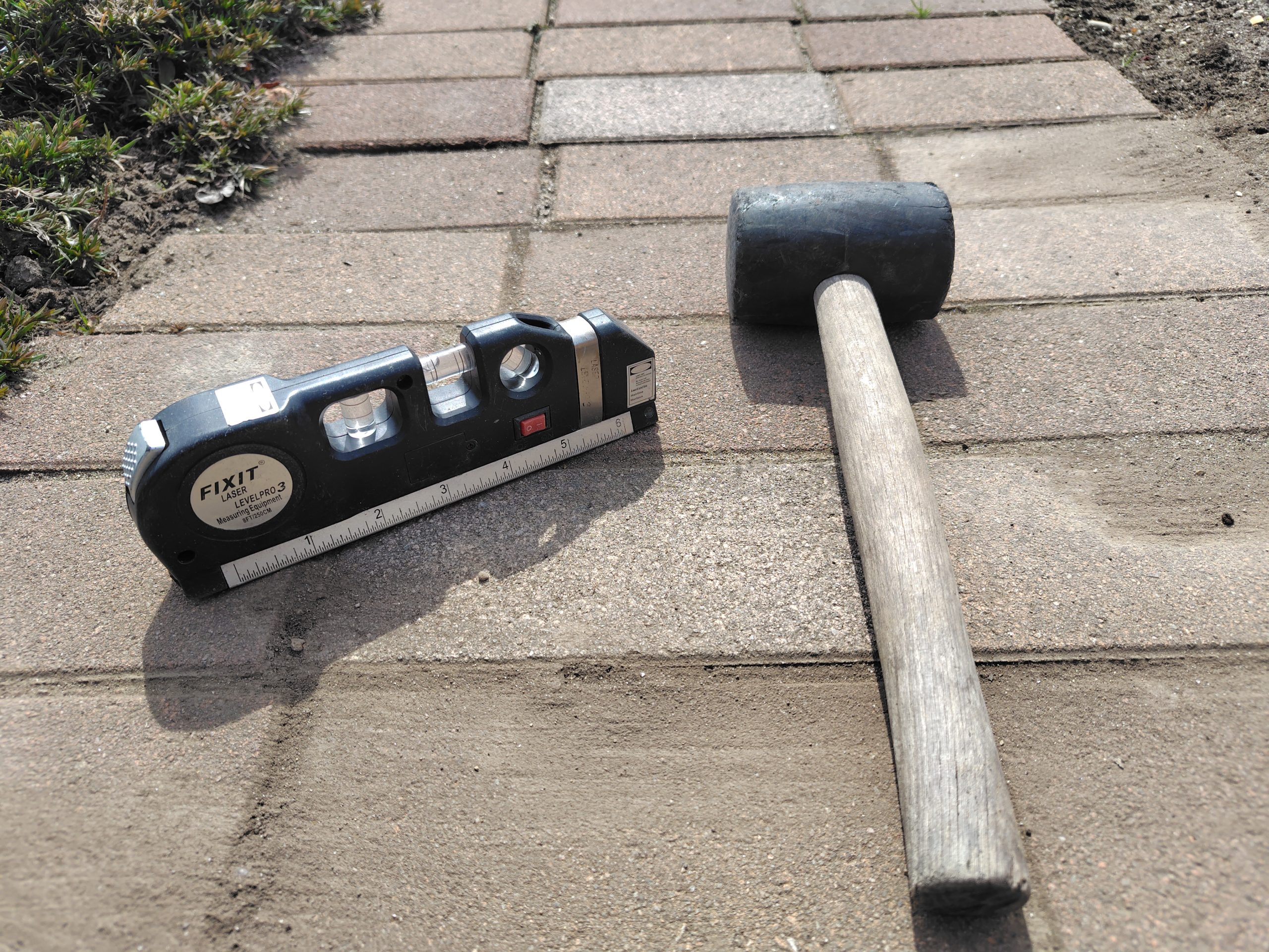 水平器とゴムハンマーを使いながら、しっかりと敷き直しました。