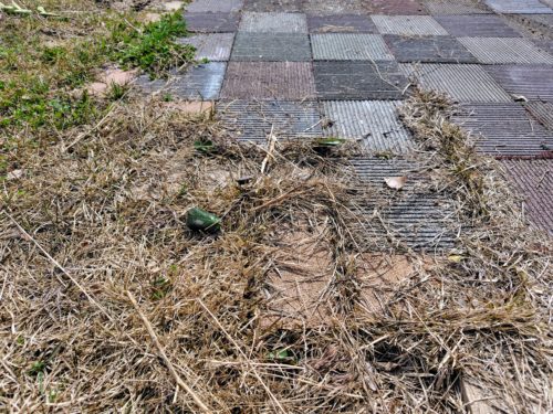 次に、ブロックの隙間に入り込んだ芝を丁寧に取り除くため、一度ブロックを寄せて作業を進めました。