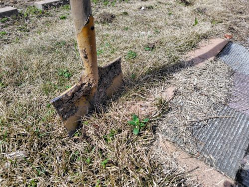 まず、テラスの縁に沿ってスコップを差し込み、芝の根を寸断。