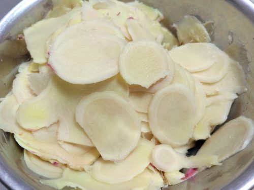1. 新生姜はよく洗い、皮をスプーンでこそげ取る。