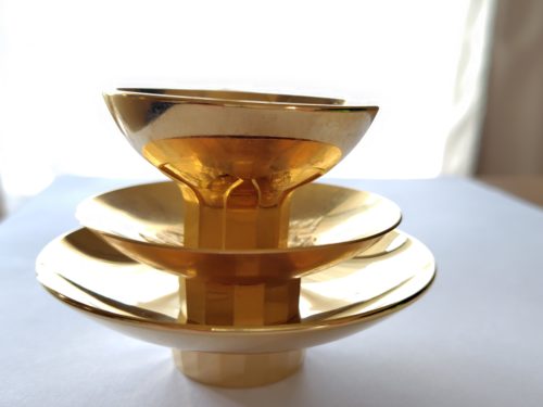 棚の奥から、金色に輝く盃が3つ、ひょっこりと出てきました。