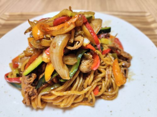 名付けて「畑で採れた野菜を使った豚バラ焼きそば 自家製食べるラー油のトッピング」。