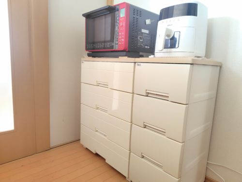 食器棚の上を外して電化製品を置いている