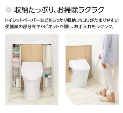 しかも、キャビネット内にはお掃除道具やトイレットペーパーをしまえる収納スペースもあり、
