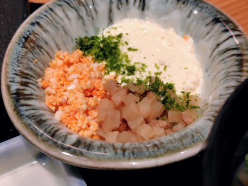 刻んだいぶりがっこ、ゆで卵、マヨネーズが別々に盛られていて、