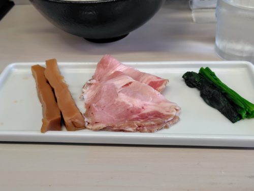 チャーシュー、ほうれん草、メンマは別皿で提供されます。