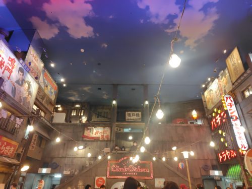 地下フロアは昭和33年当時の街並みが再現されており、古い看板や路地裏、駄菓子屋などが並ぶノスタルジックな空間が広がっています。