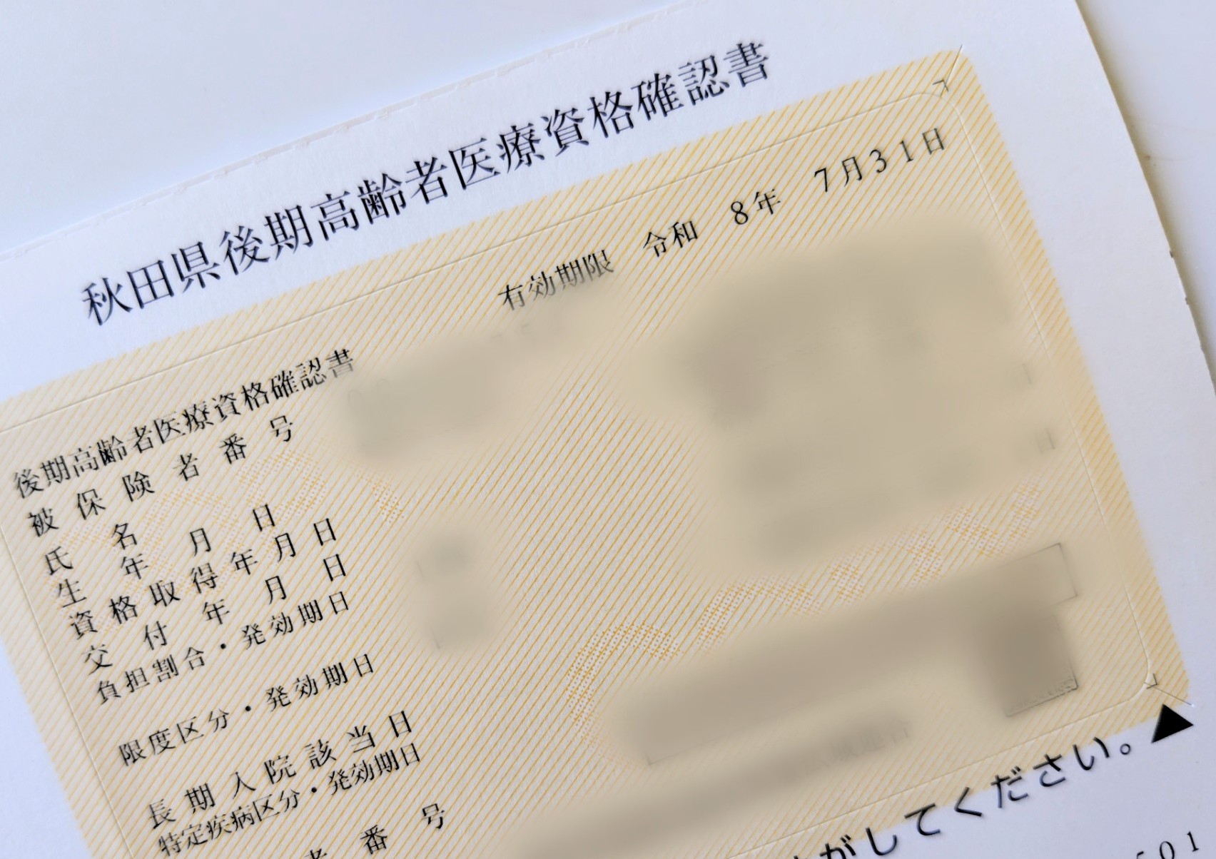 資格確認証には、有効期限として「令和8年7月31日」と明記されていました。