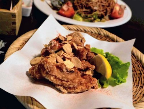 骨付き鶏肉をパリッと揚げた香ばしい山賊焼き。にんにくチップとの相性も抜群。