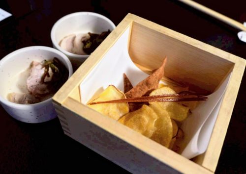 最初に出てきたお通しですが、さつまいもと、たぶん、棒状と平たく伸ばした四角い蕎麦を素揚げにしたもの。パリパリでおいしい!