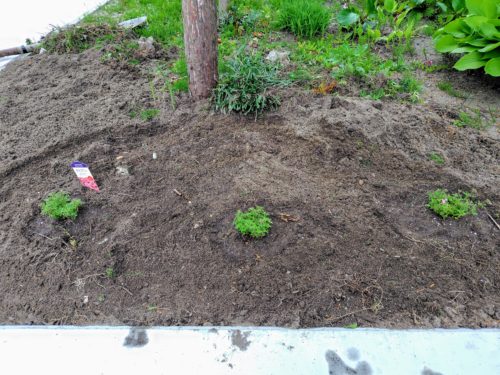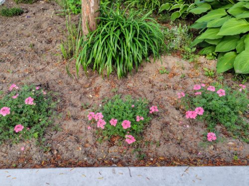 以前は雑草がびっしりだったスペースでしたが、ピンクのタピアンを3株だけ試しに植えてみました。