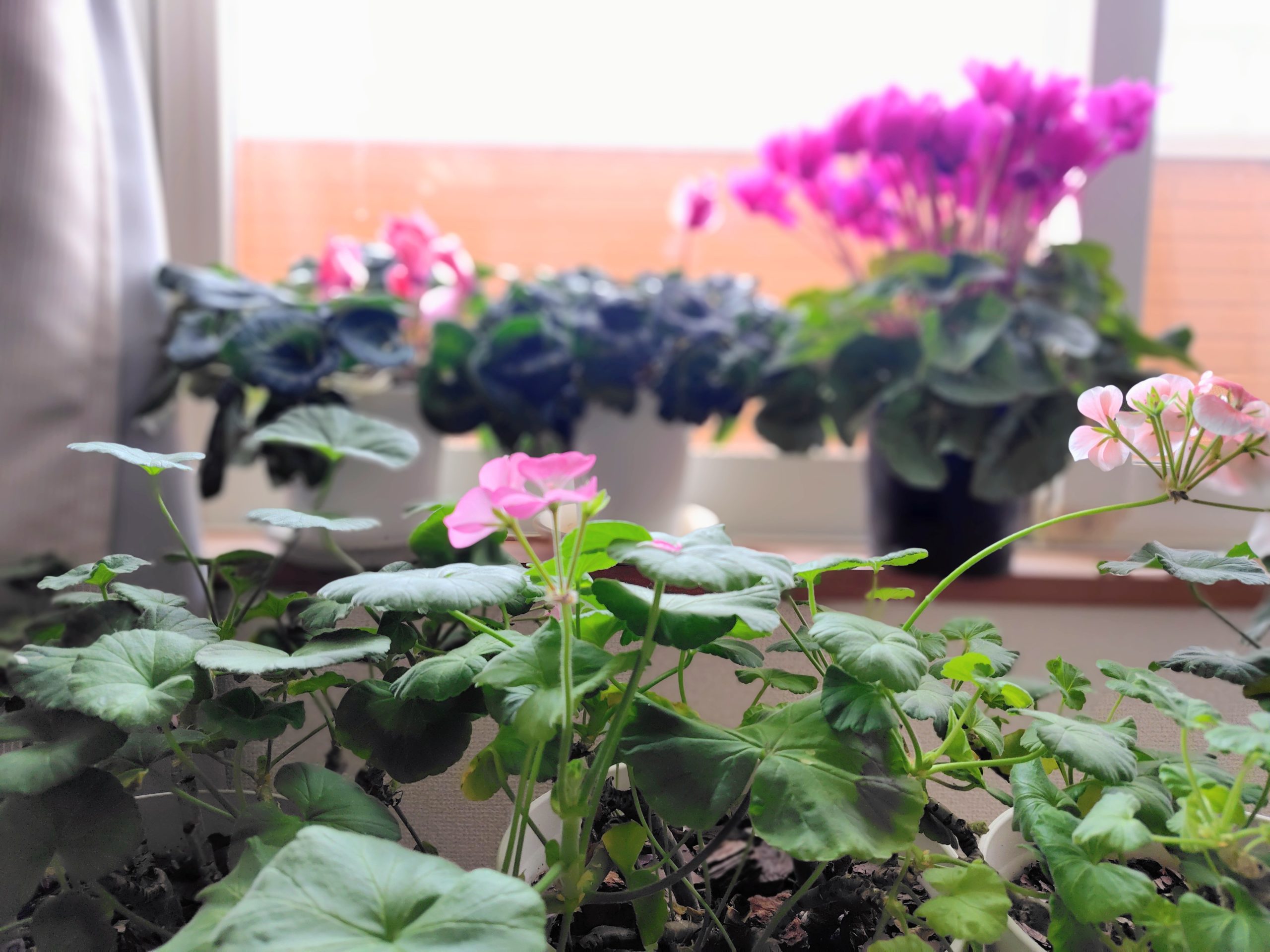 仮住まい窓辺のゼラニウムとシクラメン