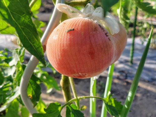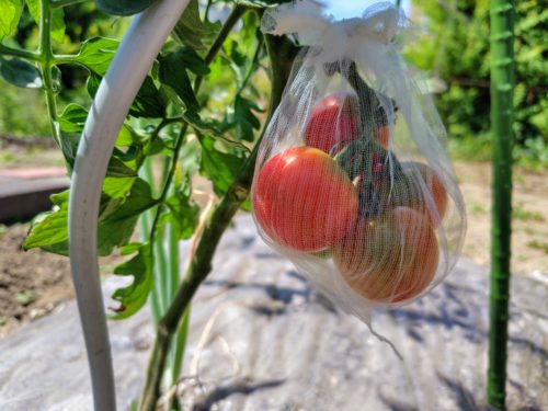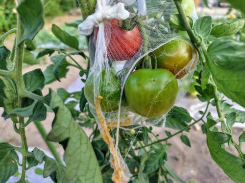 赤くなりかけたトマトに、ストッキングタイプの排水口ネットをかぶせてみたところ……