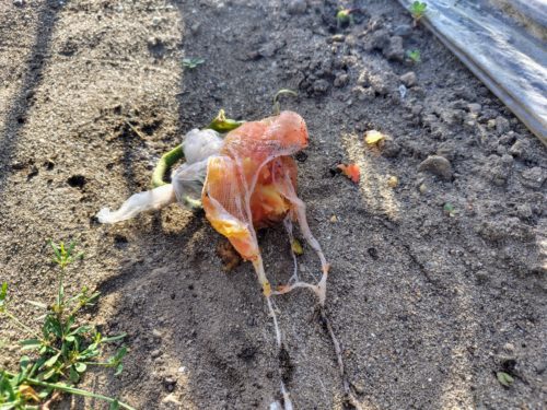 いつものように、朝、畑を見回っていたら、トマトの下になにかの残骸が…?